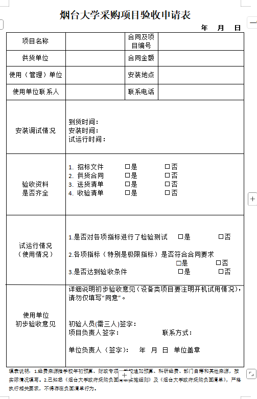 烟台大学采购项目验收申请表 返回列表 2026.04.07 打印 分享 附件【附件3:烟台大学采购项目验收申请表.doc】已下载次 上一条:烟台大学政府采购履约验收书 下一条:保证金情况说明